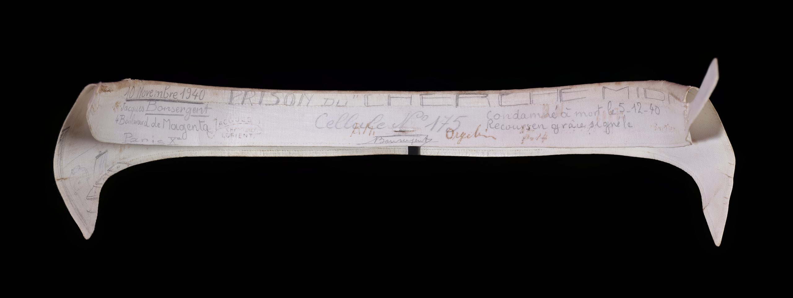 Ce col de chemise a appartenu à Jacques Bonsergent (1912-1940), qui le portait lors de sa détention à la prison du Cherche-Midi, cellule n°175, à Paris. Il fut emprisonné et condamné à mort en 1940. Cet objet était le seul support sur lequel il pouvait alors écrire en prison.