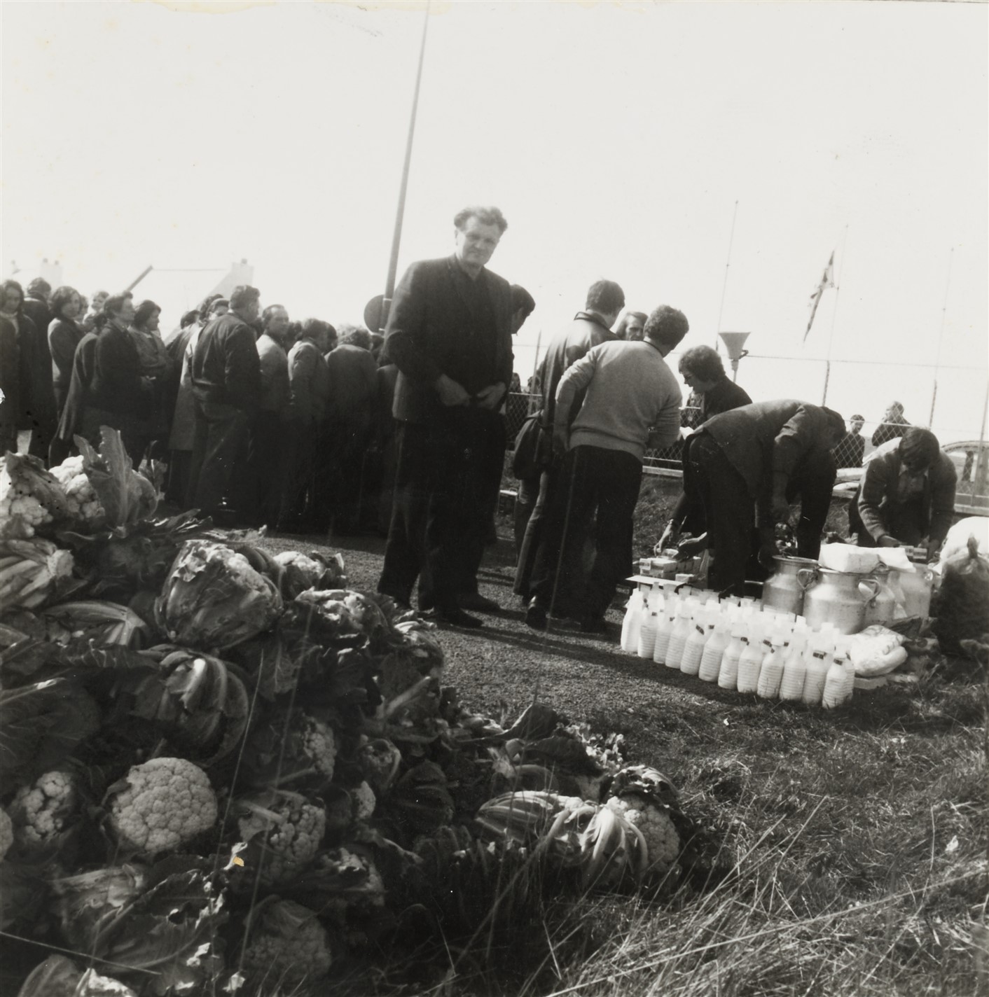 Rassemblement devant l’usine du Joint français. Saint-Brieuc. Distribution de lait de choux-fleurs. Tirage photographique noir et blanc. 8.8 x 8.8 cm, 1972. Musée d’art et d’histoire de Saint-Brieuc.